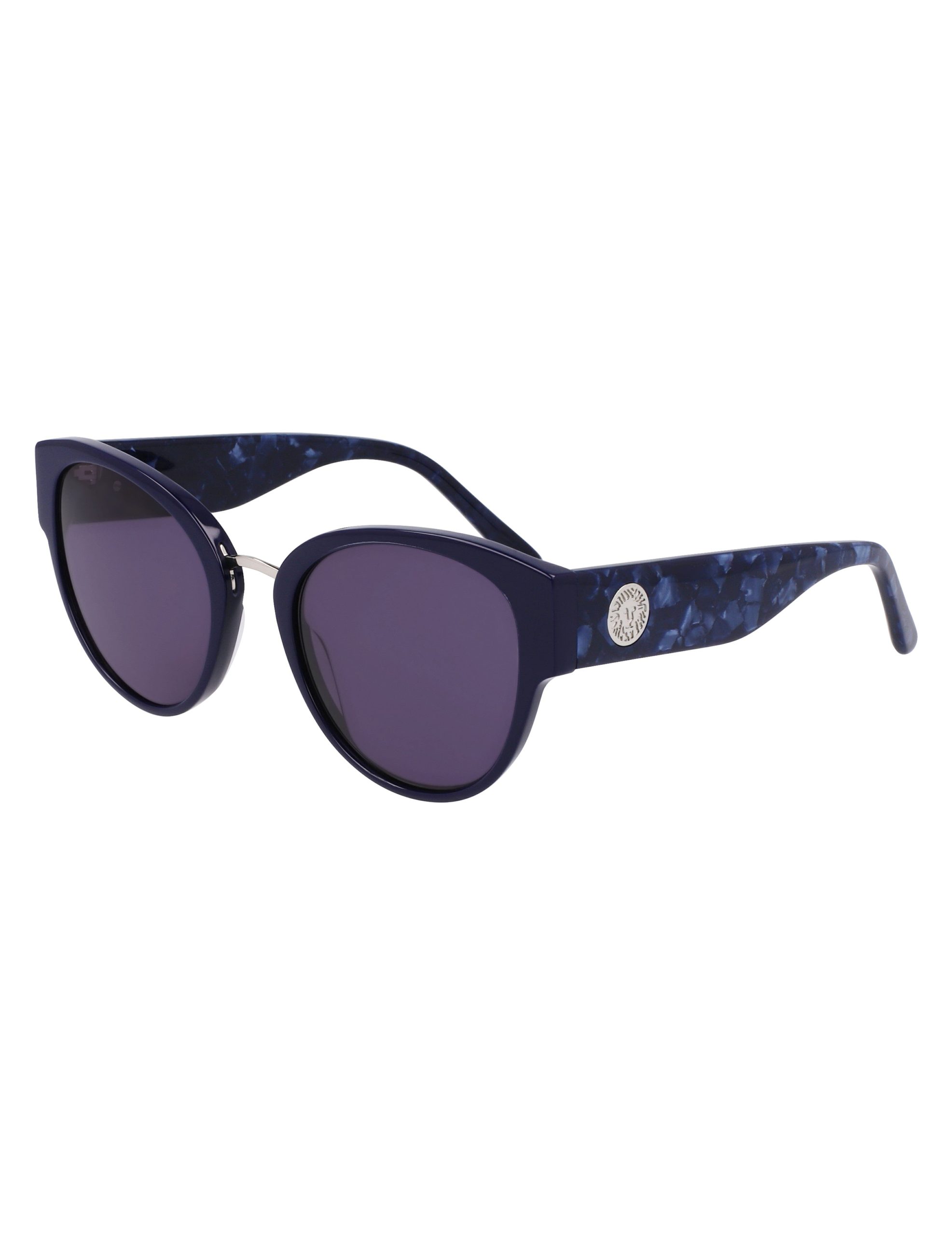 Grace your eyes with a touch of timeless elegance and contemporary flair. These exquisitely crafted sunglasses boast a sophisticated rounded cat-eye design, made with a luxurious handmade acetate frame that exudes understated glamour. The chic contrast of a shiny silver metal bridge adds a modern edge, while the trend-driven chunky temples showcase an oversized silver round metal Leo Lion logo insert, elevating your style to new heights. The solid navy front seamlessly complements the pearlized navy marble temples, offering a unique blend of classic and modern aesthetics. Complete with solid smoke lenses, these sunglasses ensure both style and protection, making them a quintessential accessory for any fashion-forward individual.