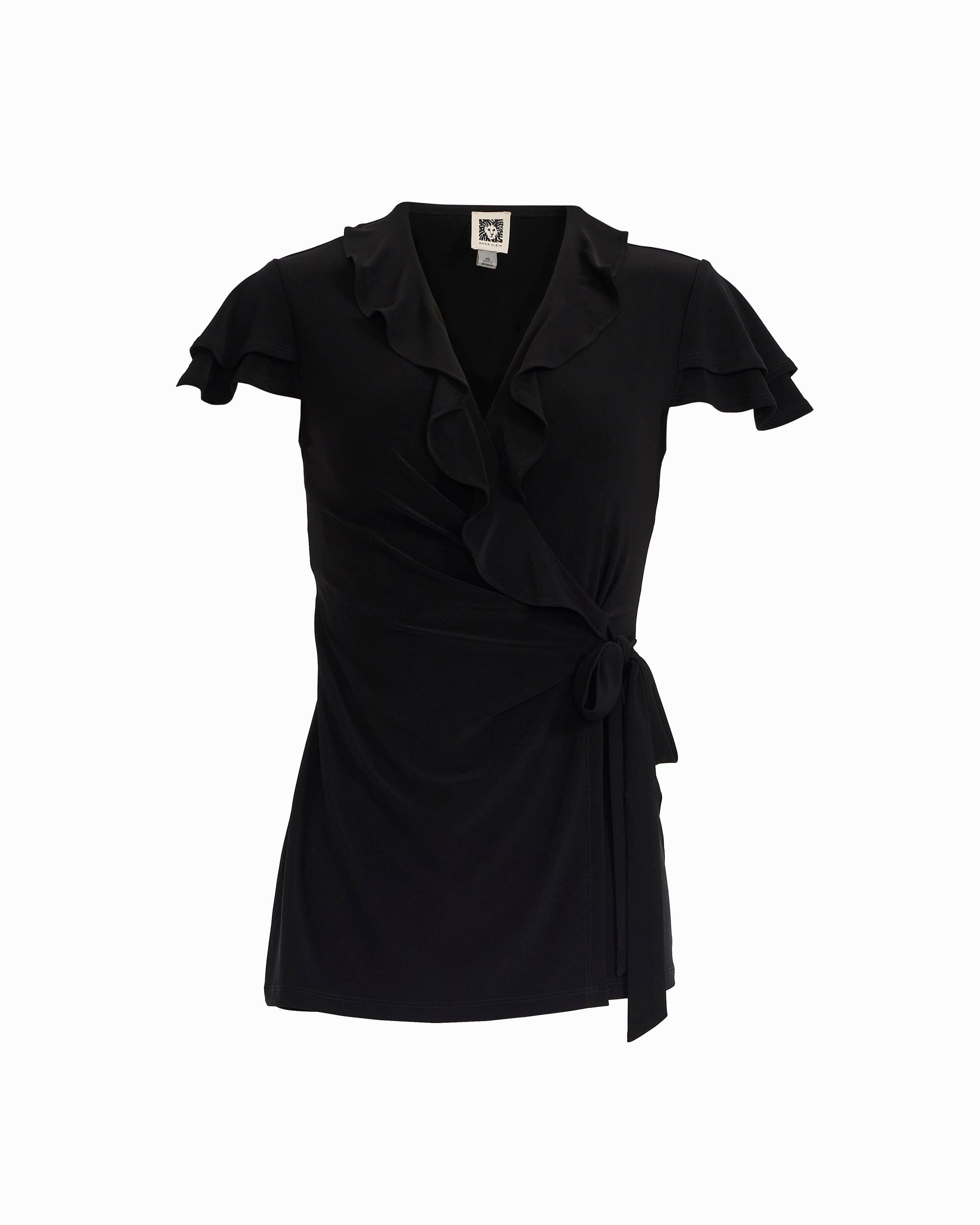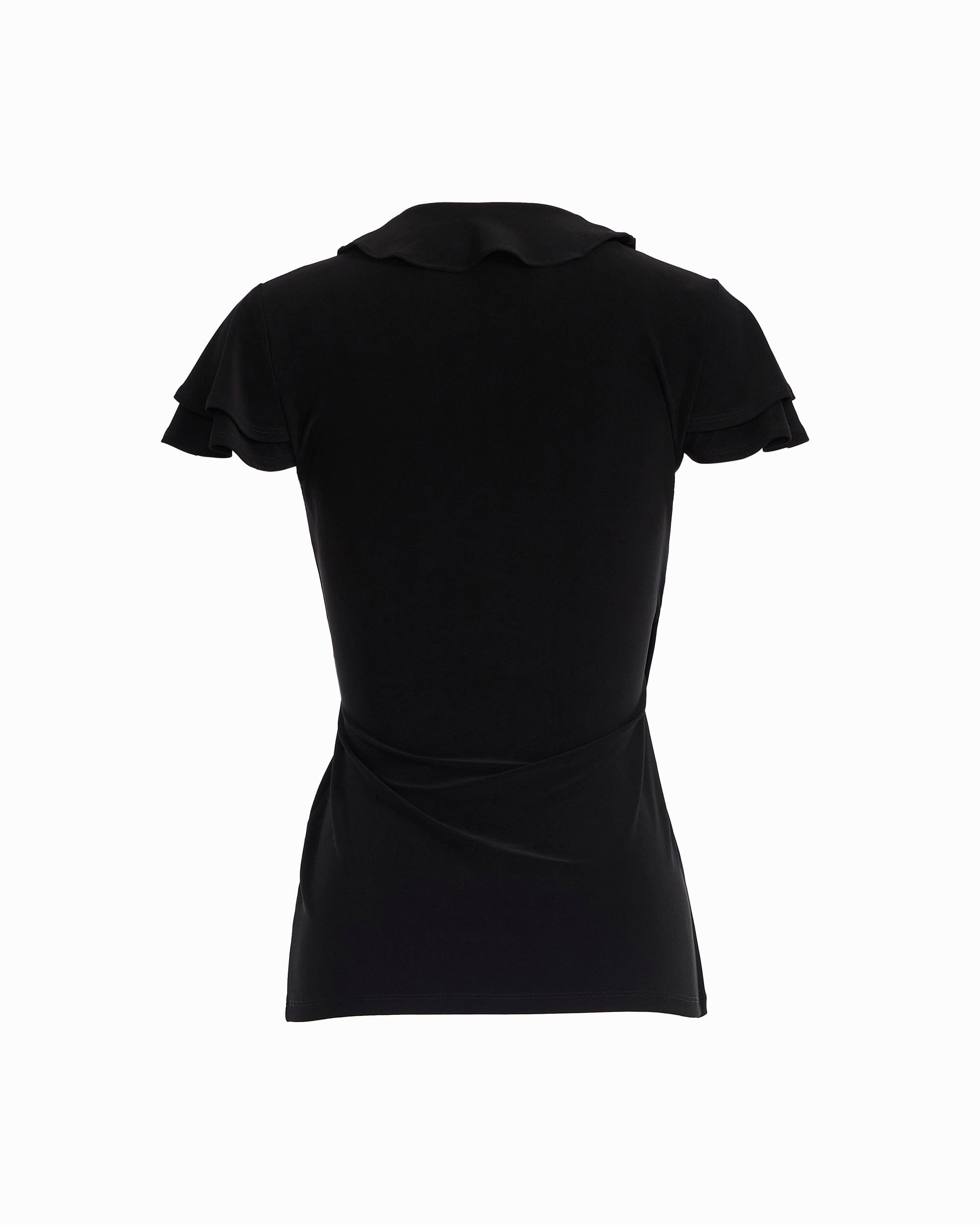 This wrap top gets its shape from a true wrap closure that cinches at the waist, creating a flattering, defined silhouette without relying on a stiff structure. Flutter sleeves add movement and a feminine finish, while a ruffle detail along the wrap edge gives the neckline real dimension and visual interest.