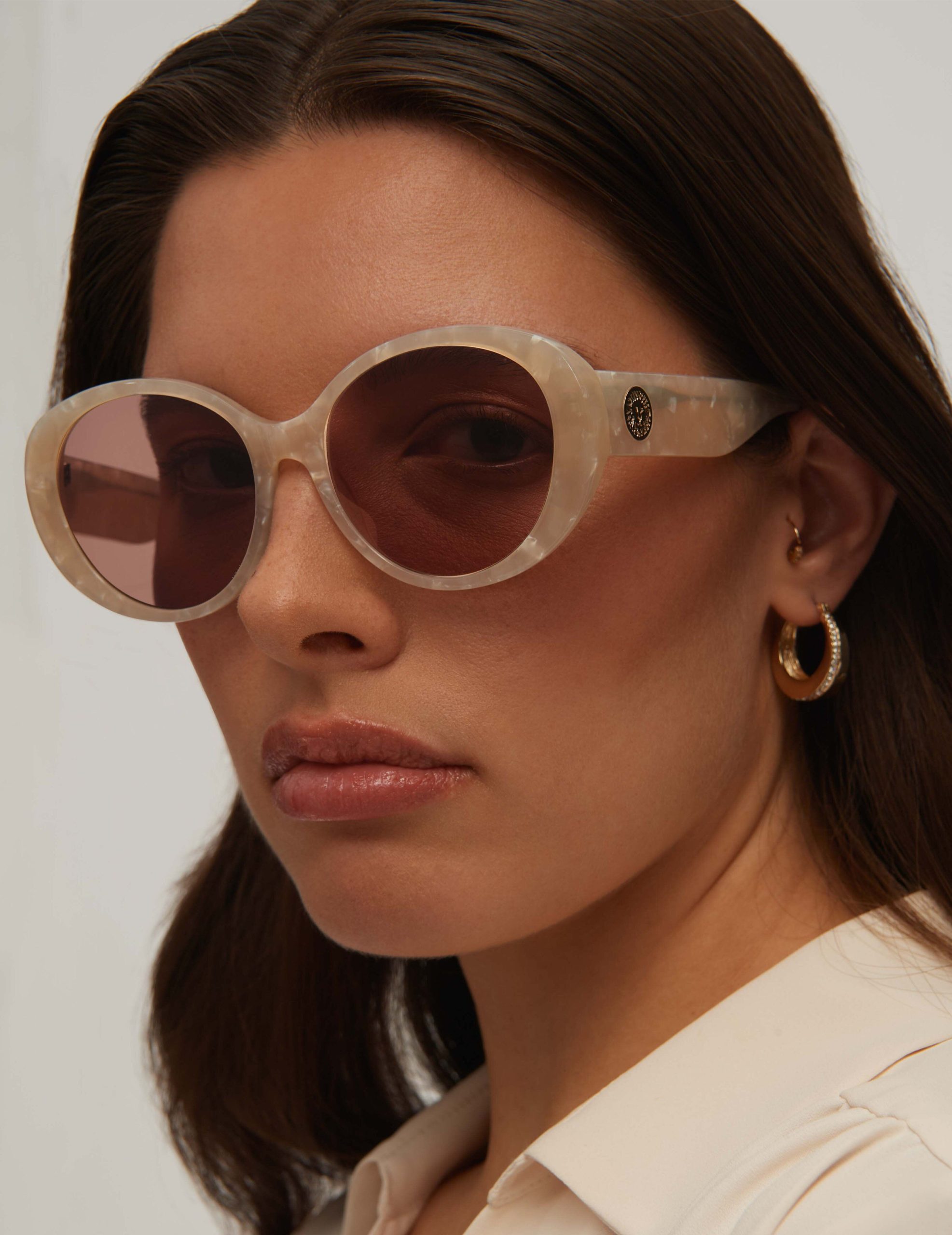 Elevate your accessory collection with a touch of timeless elegance through these exquisite sunglasses. The sophisticated interplay of the pearlized ivory marble front and temples is not just a visual delight but a statement of enduring style. The trend-driven chunky temples are adorned with a luxurious oversized gold round metal Leo Lion logo insert, offering a nod to iconic design elements that define high fashion. The handmade acetate frame ensures durability while providing a lightweight feel, perfect for those who appreciate both form and function. Solid brown lenses provide a soothing contrast, adding a layer of mystique and allure to your everyday look. Discover a world where craftsmanship meets contemporary allure, all for a price that belies its luxury.