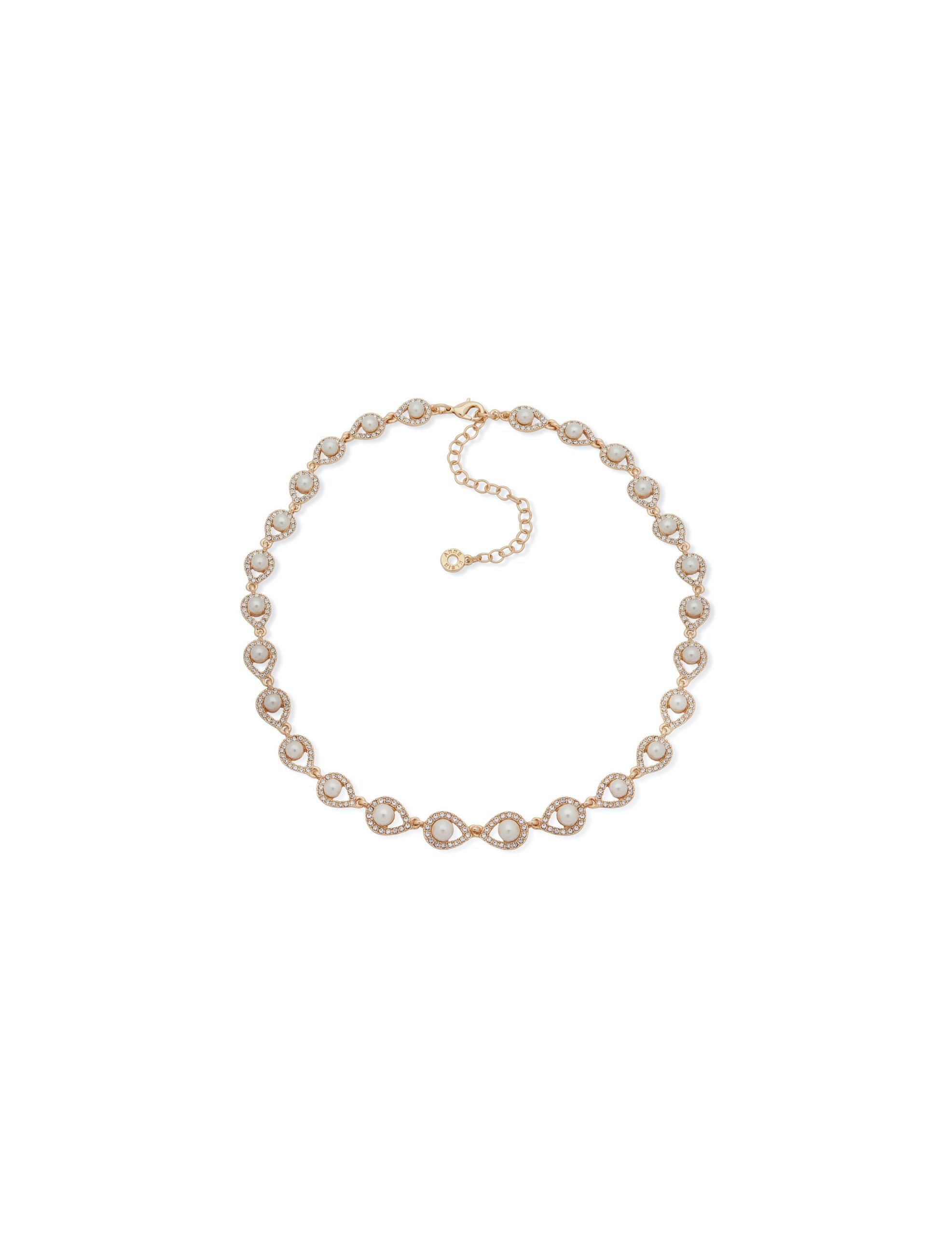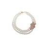 This gold-tone necklace features blanc faux pearls and pave crystal settings.
