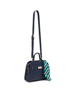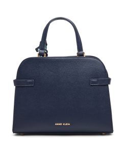 A dome-shaped satchel built on clean lines, the belted front panel and gold-tone hardware give this navy bag a tailored finish that holds its own in any professional setting. The detachable strap converts from top handle to crossbody, making it practical across the full day.