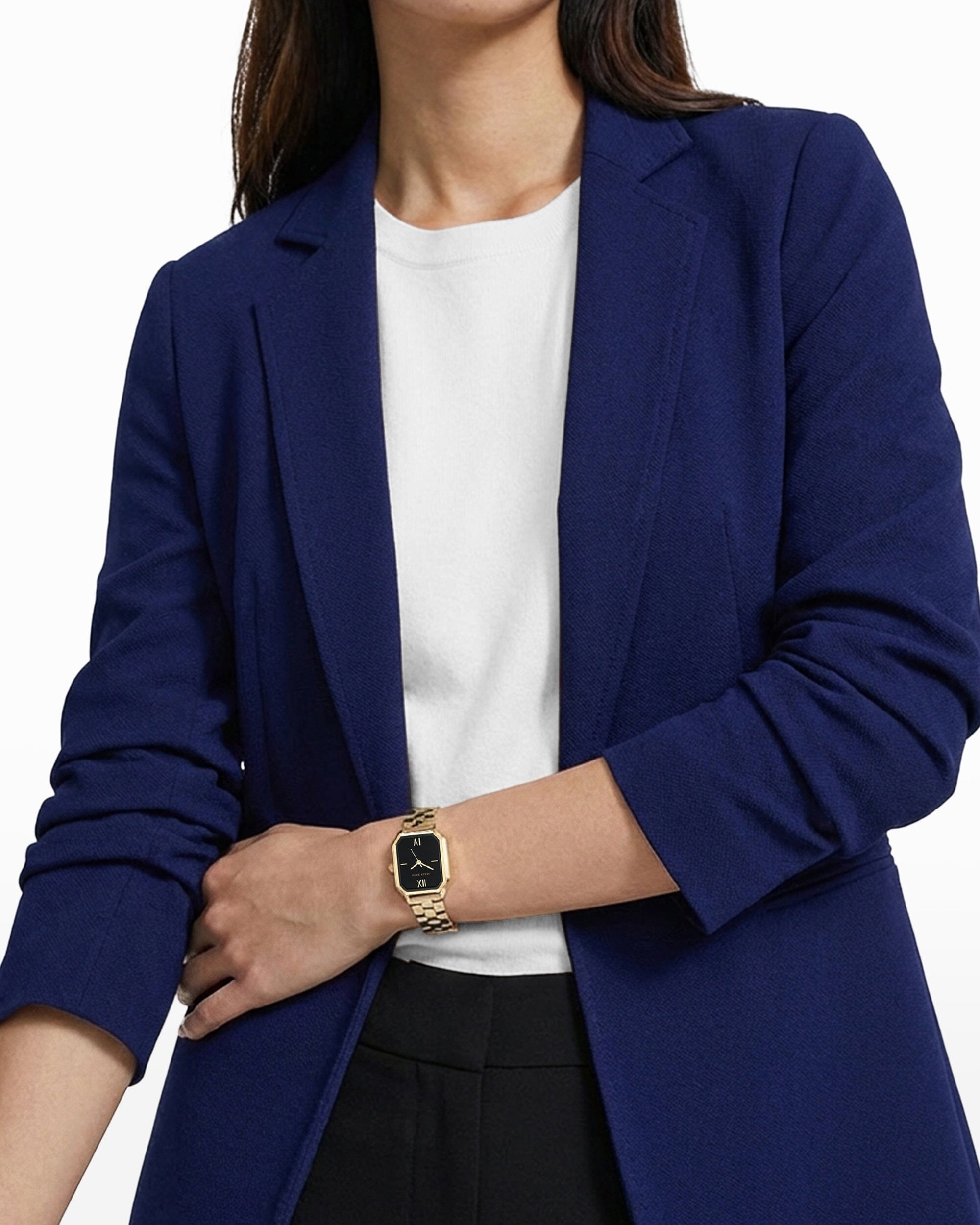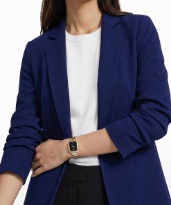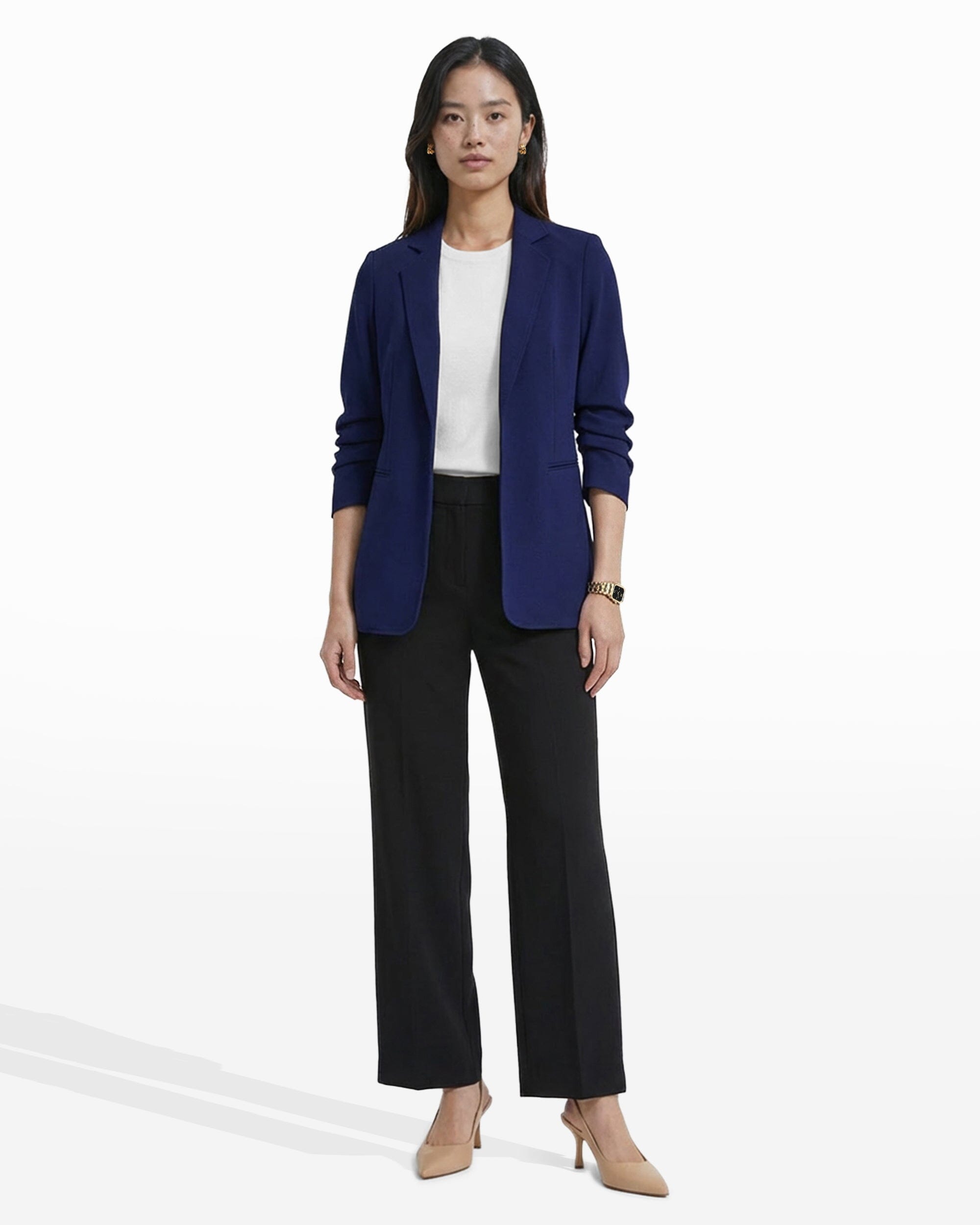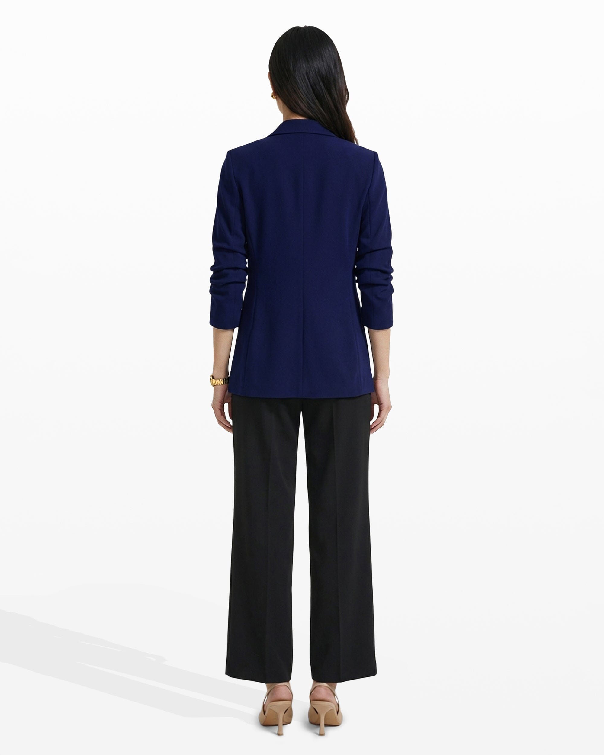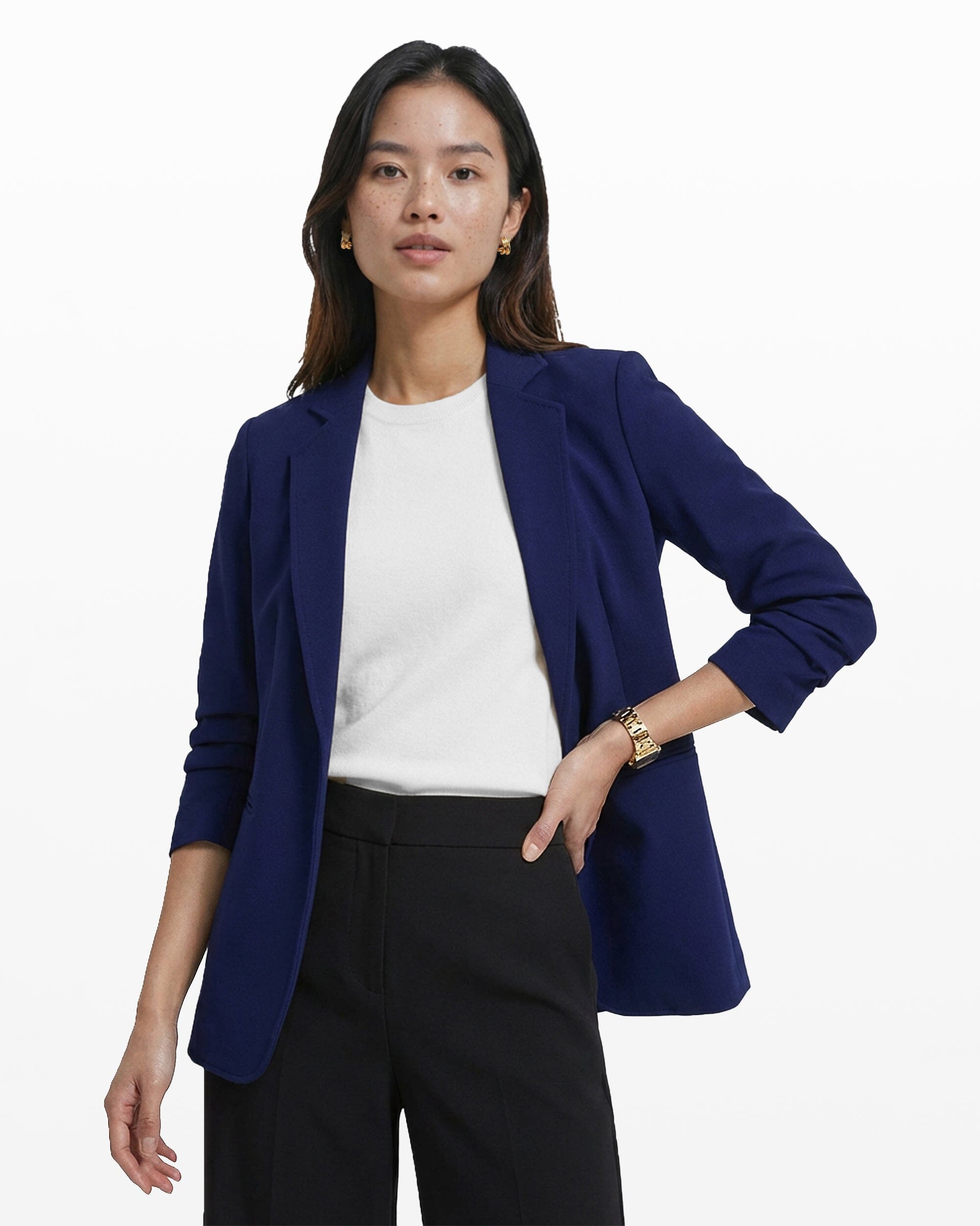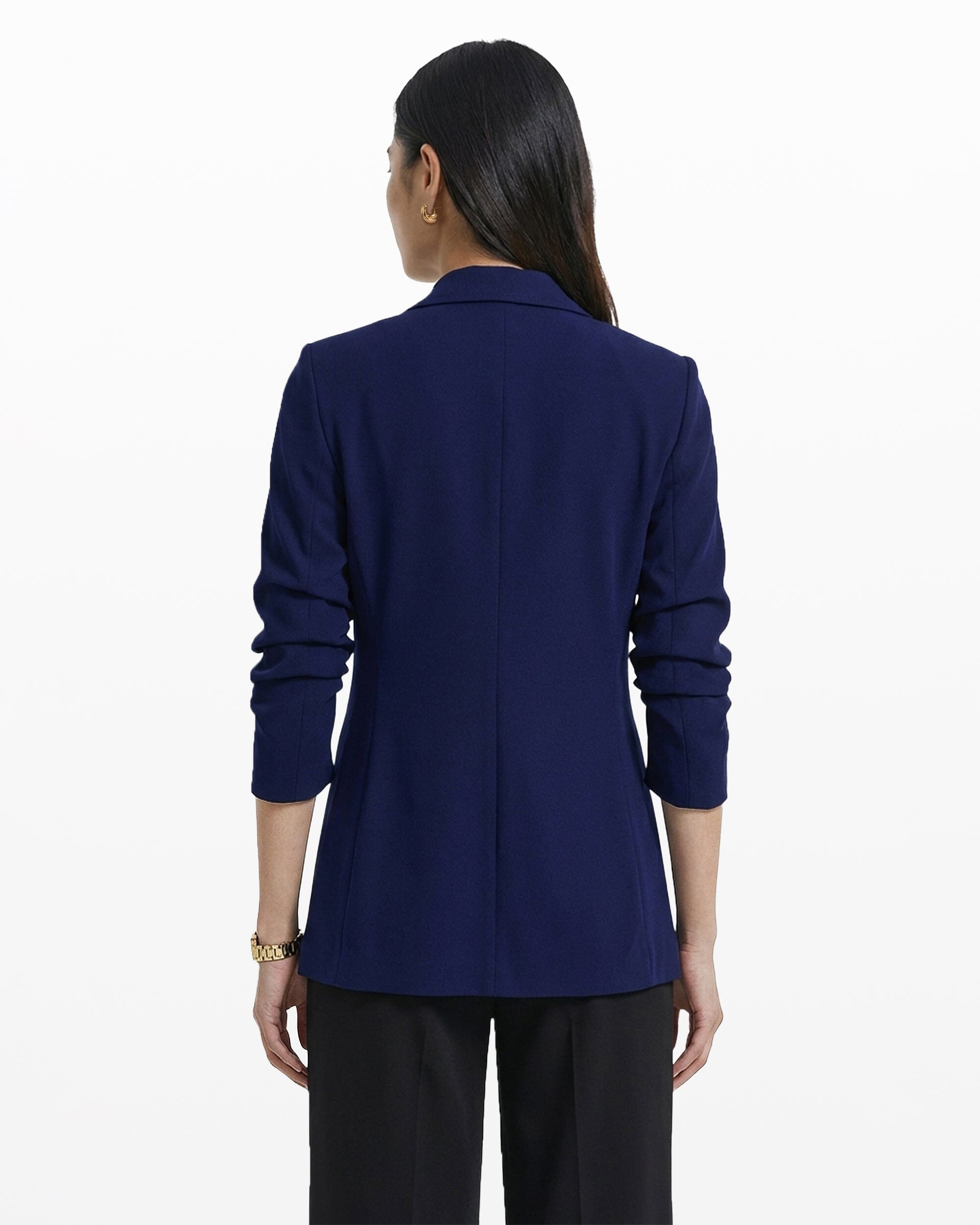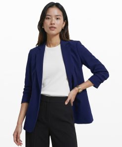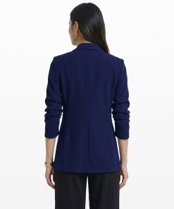 A royal blue open-front blazer in a stretch knit, with a notched lapel, ruched sleeves, and welt pockets at the high hip. The kind of piece that pulls a client presentation outfit together in under five minutes, with no extra layering required.