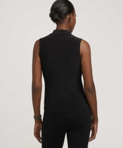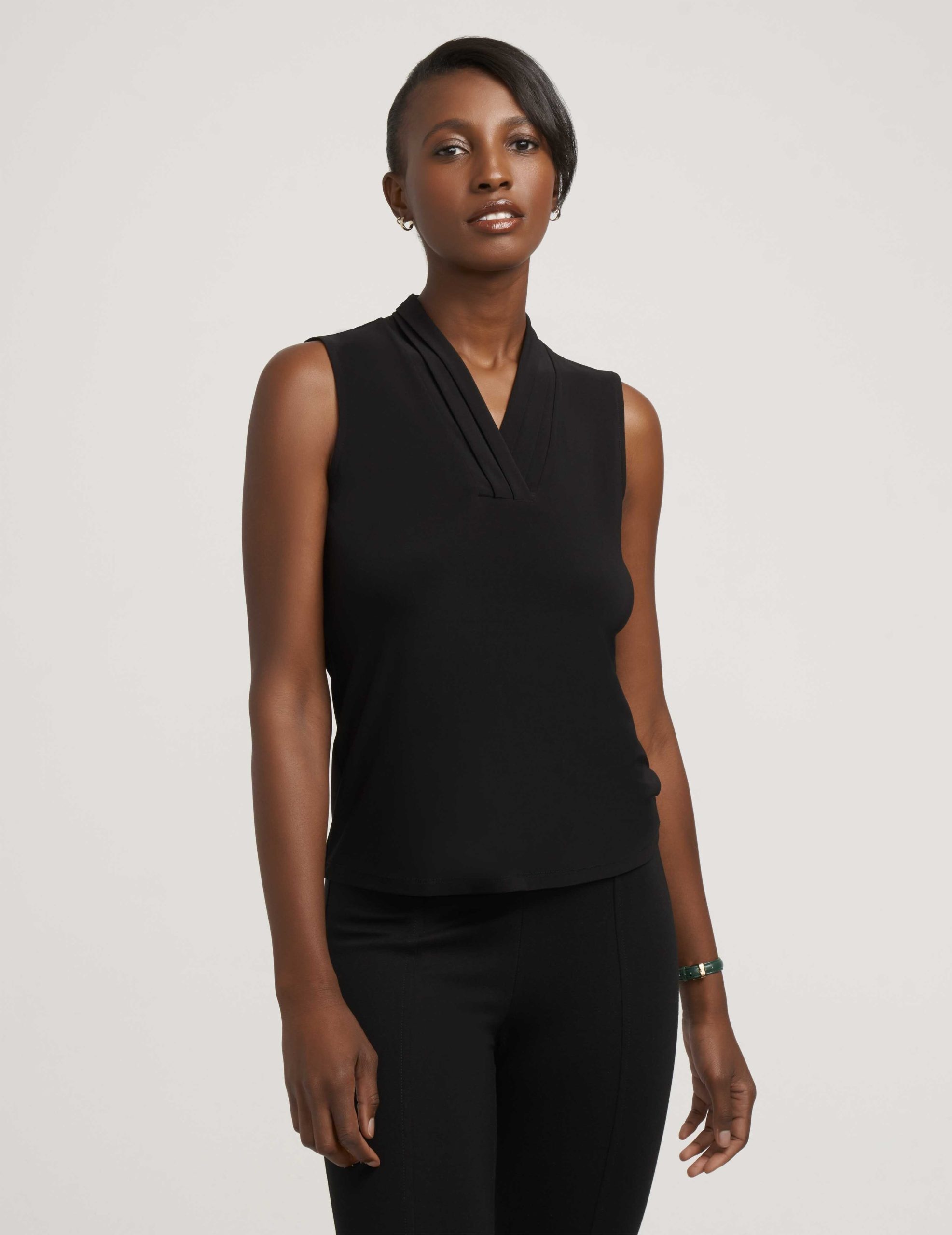 A sleeveless shell in a smooth stretch polyester blend, built around a V-neckline with three narrow vertical pleats that create clean structure at the collarbone. The slim, petite-proportioned cut makes it a reliable anchor for a suit layer or a polished pairing with tailored trousers on a full day of back-to-back meetings.