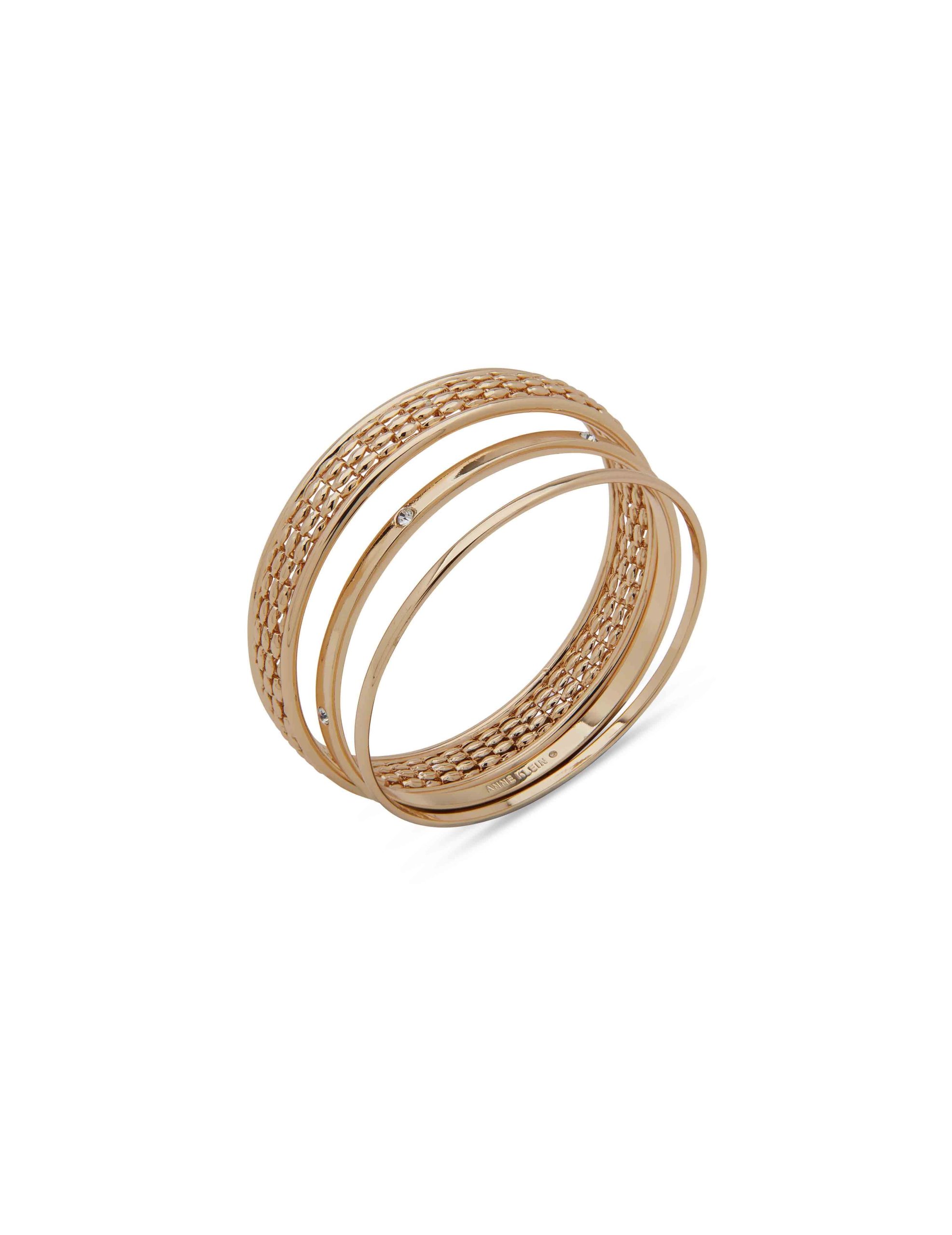 Elevate your accessory collection with our set of three gold-tone bangles, elegantly presented in a gift box for a touch of sophistication.