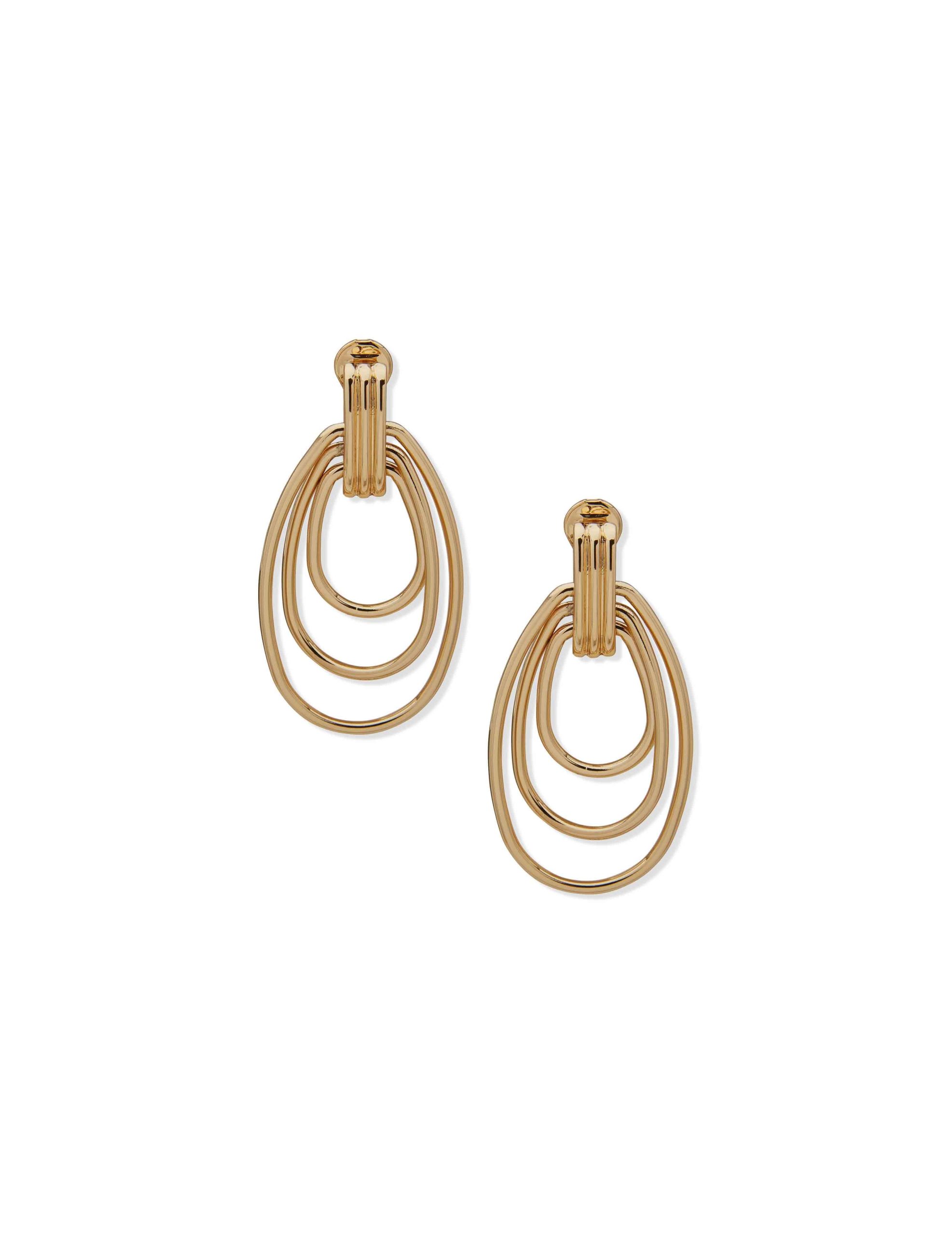 Elevate your fashion game with our Gold-Tone Three-Row Doorknocker Drop Earrings, a striking accessory that brings a touch of sophistication and glamour to any look.